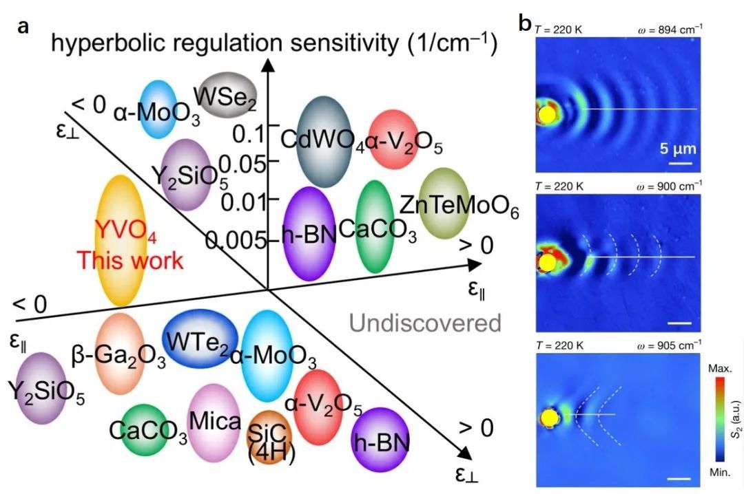 图1 (a)传统双曲材料与钒酸钇晶体的介电张量符号关系及双曲范围;(b)基于钒酸钇晶体的温度驱动光学拓扑转变